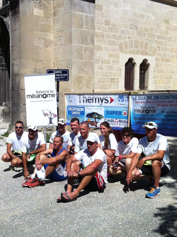 L’arrivée du des sportifs participant au duathlon contre le mélanome a eu lieu comme prévu samedi 17 août devant l’hôpital Saint-André de Bordeaux. Toute l’équipe accompagnante ainsi que des représentants de l’association Vaincre le Mélanome ( présidente, trésorier, adhérents) étaient présents pour les accueillir. Le Dr Thomas Jouary, praticien hospitalier à l’hôpital St André fortement impliqué dans les cancers de la peau s’est joint à l’assemblée présente.