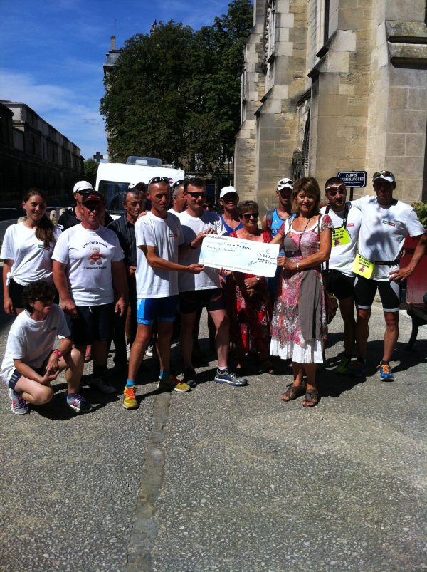 Après un pot d’accueil et les félicitations aux sportifs qui ont réussi ce duathlon entre Grenoble et Bordeaux, la remise d’un chèque de 3000€ représentant la collecte faite aux villes-étapes a eu lieu. Cette somme sera entièrement reversée à la recherche contre le mélanome par l’intermédiaire de Vaincre le Mélanome.