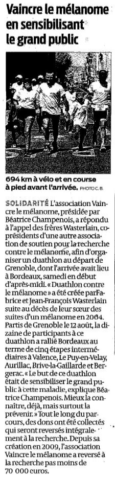 À l’initiative de Fabrice et Jean-François Wasterlain, endeuillés par la disparition de leur sœur Caroline, un duathlon contre le mélanome entre Grenoble et Bordeaux a eu lieu du 12 au 17 août 2013.