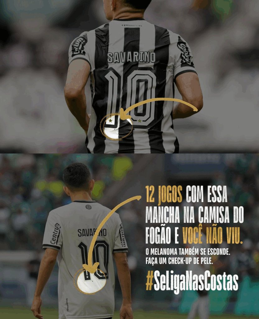 Ingénieuse idée que celle d’intégrer dans le dos sur les maillots des joueurs une tache sombre. Cette tache va au fur et à mesure du temps et des matchs joués, s’agrandir… initiative de l’institut mélanoma Brasil.