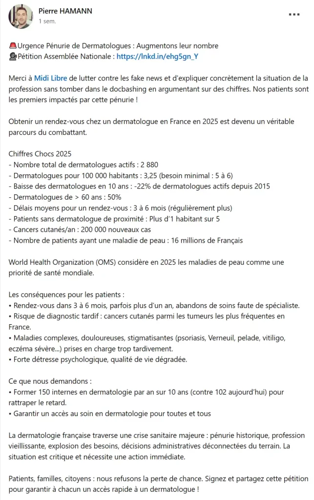 Ci dessous le post du Dr Pierre HAMANN dermatologue.