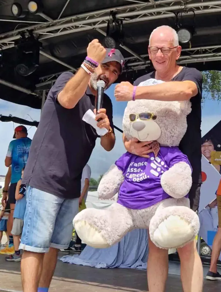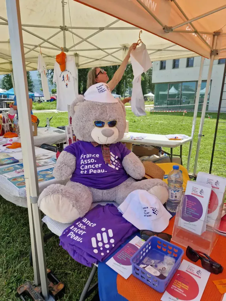 Si la LIGUE apportait de nombreux conseils et informations auprès du grand public, Nathalie a pu de son coté compléter les différents axes de prévention sur les risques de trop fortes expositions aux rayons U.V du soleil. Pour ce faire aider, EUGÈNE la mascotte sportive de France Asso Cancer et Peau était présente. Son rôle a été des plus déterminant à la fois au poste de secours, sur la ligne de départ, auprès des médias, des participants ainsi qu’a la clôture avec le maire de la commune. Bravo EUGÈNE nous te remercions.
